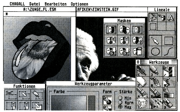Neben der herkömmlichen Werkzeugführung analog zur Mausbewegung haben die Programmierer eine Art Schablonenführung vorgesehen. Sie ziehen zuerst eine geometrische Grundform oder eine freie Kurve, gemischt aus Linien und Bezierkurven, auf. Anschließend läuft das Werkzeug den vorgegebenen Weg automatisch nach. Praktisch für das zitterfreie Nachzeichnen von Objektkonturen. Unverzichtbar für die Bildverarbeitung sind die Maskenfunktionen, in Chagall als Halbtonbild mit 256 Zwischenstufen angelegt. Zum Anlegen einer solchen Maske stehen Ihnen wiederum nahezu alle Werkzeuge zur Seite. Allerdings ist die Vorgehensweise, soweit schon beurteilbar, nicht immer ganz einfach und konsequent. Neben Spezialitäten wie Filter oder Gammakurven sind auch umfangreiche Blockoperationen vorgesehen, die aber in unserer Version noch nicht vollständig implementiert waren. Naturgemäß gibt diese Vorstellung nur einen kleinen Einblick in die reichhaltige Werkzeugkiste von Chagall. Bleibt auch bisher noch einiges anzunörgeln, wie z.B. der langsame und umständliche Bildaufbau oder diverse Kinderkrankheiten bei der Färb- und Werkzeugeinstellung, so scheinen sich trotzdem mit Chagall neue Maßstäbe in der Bildverarbeitung auf dem Atari anzubahnen, nicht zuletzt aufgrund der geplanten Modularität. Gemessen an dem leibhaftigen Namenspatron bleibt zu sagen: Nomen est Omen!