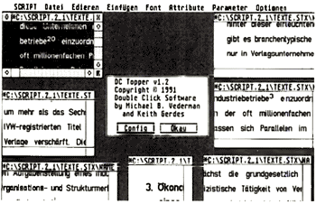 Sicher, die Arbeitsersparnis hält sich in Grenzen, aber viel erfreulicher ist ja auch das Ende eines notorischen Ärgernisses. DC Topper macht dem begriffsstutzigen Computer klar, was dem Anwender stets natürlich erschien: Zeigen reicht, nochmal zu klicken ist doppelt gemoppelt. Das Accessory macht sich besonders erfreulich im Desktop bemerkbar, wenn mal wieder alle Fenster geöffnet sind. Aber auch in allen GEM-Programmen erledigt es zuverlässig seinen Job. Wem DC Topper mal zu voreilig ein Fenster aktiviert, das der Mauspfeil nur versehentlich streifte, verbietet ihm den Mund, solange er auf die rechte Maustaste drückt. Aber auch an Traditionalisten ist gedacht: Für Sie gibt es die Default-Einstellung »OFF«.