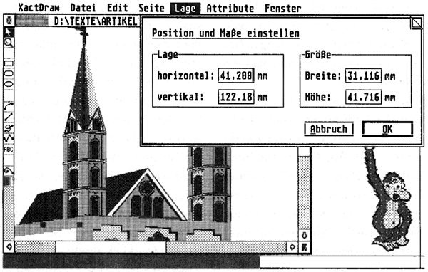Der SciGraph-Nachfolger Xact aus dem Hause Sci Lab setzte unlängst neue Maßstäbe im Bereich der Präsentationsgrafiken. Was lag also näher, als den Vektorgrafikteil auszukoppeln und als eigenständige Applikation zu vertreiben. Wie schon sein großer Bruder ist Xact Draw vollständig in GEM eingebunden. Menüleiste, Fensterausgabe und fliegende Dialoge gehören genauso dazu, wie Shortcuts für die wichtigsten Befehle. Aufgrund der engen GEM-Anbindung setzt das Programm die Installation von Ataris ungeliebtem Stiefkind, dem GDOS, für die Inbetriebnahme voraus. Das im Lieferumfang enthaltene Installationsprogramm übernimmt auf Wunsch das komplette Kopieren und Einrichten des ebenfalls mitgelieferten AMCGDOS, sowie der zugehörigen (Pixel)Fonts und Treiber. Falls Sie nicht so versiert in Sachen GDOS sind, helfen Ihnen die ausführlichen Erläuterungen des Handbuchs weiter. Besitzer von NVD1 sollten übrigens möglichst eine Version ab 2.11 verwenden. Alle für das Zeichnen benötigten Werkzeuge finden Sie am linken Fensterrand in einer Iconleiste übersichtlich angeordnet. Alles weitere regeln Sie über die Menüpunkte und deren Dialogboxen. Für das Entwerfen der Grafiken stehen Ihnen alle Grundobjekte wie Kreise bzw. Ellipsen, Rechtecke oder Linien und Polygone zur Seite. Letztere verwandeln Sie kurzerhand auch in Bezierkurven und wieder zurück. Kleines Ärgernis am Rande: Zum Beenden des Objektanlegens bedarf es eines Doppelklicks bzw. dem gleichzeitigen Drücken der Controltaste. Etwas umständlich, wo es doch auch eine (im Programm nahezu ungenutzte) rechte Maustaste gibt. Sie müssen sich schon vor dem Anlegen eines Objektes entscheiden, ob Sie beispielsweise nur einen Ellipsensektor oder das komplette Objekt wünschen. Ein nachträgliches Aufbrechen von Linienzügen oder Objektumrißen unterstützt XACT-Draw leider nicht.