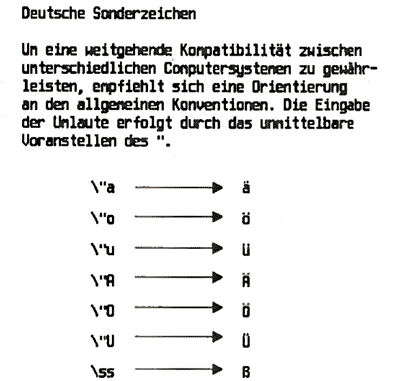 Die klassische, wenn auch etwas antiquierte Lösung zur Übertragung von Daten ist das ASCII-Format. Generell lassen sich ASCII-Texte, die von beliebigen anderen Systemen stammen, ohne besondere Probleme übertragen, sofern der Schreiber sich an die üblichen Konventionen hält. Schließlich verarbeitet TeX ja selbst ausschließlich ASCII-Quelltexte. Probleme gibt es höchstens mit den deutschen Sonderzeichen. Um ganz sicherzugehen, daß auch andere TeX-Compiler (z.B. UNIX-Maschinen) den eigenen Text verarbeiten, sollten Sie die Sonderzeichen in kompatible Befehlsfolgen umwandeln (Bild 3).