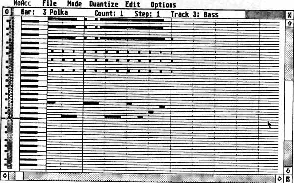 Etwas hölzern mutet 1993 auch das übrige Handling des Sequenzers an. Wo andere Systeme bereits seit Jahren mit frei per Maus verschieb- und kopierbaren Parts arbeiten, bedient sich Midichord noch der recht sperrigen Marker-Technik: Wollen Sie z.B. einen bestimmten Teil einer Spur verdoppeln, müssen Sie zunächst die Funktion »Copy« anwählen, dann per Start- und Ende-Marke den Quellbereich kennzeichnen und schließlich mit einem finalen Klick das Zielgebiet anvisieren. Damit ist nun aber noch gar nichts kopiert, denn es erscheint eine große, sinnigerweise auch noch den Blick auf das Sequenzerfenster versperrende Dialogbox, in der sich weitere Details festlegen lassen. Solcher Umstand vermag den Rezensenten nicht gerade zu begeistern.