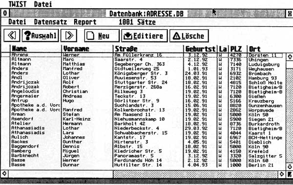 Seit unserem Schwerpunkt »Datenbanken« in der TOS 4/92 ist es auf dem Atari relativ still geworden um diese Grundanwendung der Computerwelt. Ist der Markt etwa gesättigt, sind die Räder bereits zur Genüge erfunden, sind alle Anwender mit dem Angebot zufrieden oder will gar niemand mehr Daten mit seinem Atari verwalten? Falsch, ganz falsch, denn Maxon bringt mit TWIST neuen Schwung in die etwas behäbig gewordene »Datenverwaltungs-Szene«.