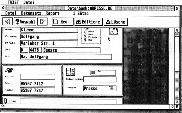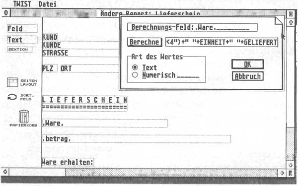 Wie so etwas in der Praxis aussehen könnte, erkennen Sie, wenn Sie Ihren Blick einmal auf Bild 3 schweifen lassen. Dort erspähen Sie in der Adreßdatenbank den leitenden Redakteur der TOS. Da es sich der Autor trotz gelegentlicher Term in Verzögerungen bei der Manuskriptabgabe noch nicht ganz mit ihm verscherzt hat, ist unter Typ das »DU« angekreuzt. Automatisch füllt Twist daraufhin das Feld »Anrede« mit dem vertrauten »Na, Wolfgang«. Welche enormen Vorzüge dieses Vorgehen z.B. beim Entwickeln von Serienbriefen bietet, sehen wir ein wenig später. Eine andere sinnvolle Anwendung des Formelgenerators wäre z.B. in einer Kundendatei alle Außenstände eines Säumigen in einem Datenfeld aufzuaddieren. Als eine der angenehmsten Eigenschaften von Twist empfanden wir, einer einmal entworfenen Maske nicht bedingungslos ausgeliefert zu sein. Twist gewährt Ihnen nämlich zu jedem Zeitpunkt über den Menüpunkt »Felder ändern« Zugriff auf die Datenstruktur und erlaubt so problemloses Anpassen der Datenbank an die jeweilige Situation. So spielt es keine Rolle, ob Sie neue Datenfelder einfügen, deren Typus von Text nach Zahl ändern oder einfach nur die Formel eines Feldes aktualisieren möchten. Ebenfalls die nachträgliche Indizierung von Datenfeldern stellt Twist von keine unlösbare Aufgabe. Zwar muß auch Twist nach derartiger Umgestaltung den Daten bestand den neuen Bedingungen gemäß umrechnen, doch wirkt dieser Prozeß für den Anwender weit weniger dramatisch und deutlich unkomplizierter als bei der Konkurrenz. Eine Spezialität von Twist in diesem Zusammenhang sind die »Updates«. Mit den Updates lassen sich auch kompliziertere Datenbank-Umstrukturierungen vollautomatisch vornehmen. Zu diesem Zweck erstellen Sie einfach im Update-Generator mithilfe der bereits erwähnte Formelsprache die benötigten Arbeitsvorschriften, und schon beginnt Twist mit der Neugestaltung. Häufiger benötigte Updates lassen sich auf Festplatte oder Diskette sichern und als Icon zum bequemen Abruf auf den Twist-Desktop legen.