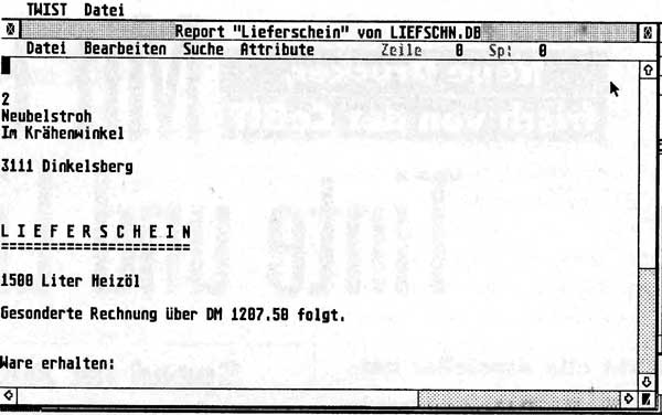 Zur Zeit konkurrenzlos präsentiert sich Twists Reporteditor. Ein Report stellt eine sozusagen »in Form gebrachte« Auswahl dar, die zumeist zur Ausgabe auf einem Drucker bestimmt ist. Reports nutzen Sie unter anderem, um Ihren kompletten Daten bestand formschön auszudrucken, Adreßaufkleber zu erstellen usw. Natürlich müssen Sie nicht immer eine komplette Datei ausdrucken, sondern können über die Formelsprache ganz gezielt Ihre »Wunschdaten« selektieren. Sie sind ferner auch nicht auf die in der Datenmaske vorgegebenen Datenfelder beschränkt, vielmehr lassen sich wiederum über die Formeln neue Felder für die optimale Datenausgabe definieren. Beispielsweise fassen Sie so über eine einfache String-Operation den Vor- und Nachnamen aus Ihrer Adreßdatei in einem Feld zusammen oder berechnen das Gesamtauftragsvolumen aller Großkunden im Raum Hamburg. Einen solchen Report erstellen Sie übrigens ohne große Mühe: Report-Editor öffnen, die gewünschten Felder mit der Maus an die gewünschte Position bugsieren, eventuell noch ein, zwei Formeln eintragen, das war's! Und wie es sich für echtes WYGIWYW (What you get is what you want) gehört, entdecken Sie bei Twist nicht erst nach dem ersten Ausdruck, was mit dem Report schiefgelaufen ist, sondern Sie dürfen das Ergebnis in aller Ruhe vorher im integrierten Texteditor begutachten. Da Sie Ihre Reports sicherlich des öfteren benutzen wollen, lassen diese sich, wie auch schon die Updates, speichern und als Icon auf dem Desktop ablegen. Denkbar einfach realisieren Sie in Twist die beliebten Serienbriefe. Sie kreieren einfach im Texteditor das benötigte Formschreiben und fügen dort, wo später individuelle Daten wie z.B. Name, Säumnisbeträge, Geburtstage etc. erscheinen sollen, entsprechende Variablen ein. Erkennen Sie jetzt den Vorteil des automatischen »Anrede« -Feldes in unserem Beispiel weiter oben? Ganz ohne zusätzliche Tipparbeit läßt sich nämlich so auch ein an sich recht formeller Serienbrief per Knopfdruck etwas persönlicher gestalten. Praktisch, oder? Ach ja, da ein Serienbrief ja nicht zwangsweise immer alle »Teilnehmer« einer Datenbank erreichen soll, läßt sich für ihn noch eine individuelle »Auswahl« definieren. Sicher haben Sie es schon erraten: auch ein Serienbrief.