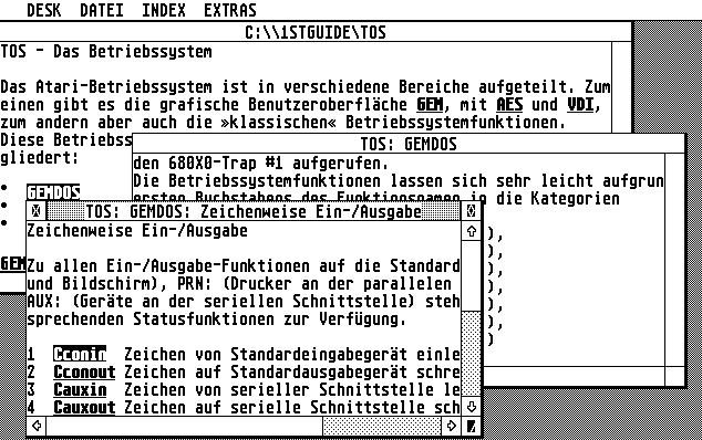 Im Gegensatz zu den meisten Hypertext-Programmen gestattet dieses, bei einer Verzweigung ein weiteres Fenster zu öffnen. So behält man den ganzen Informationsweg im Auge, ja kann sogar mehrere verschiedene Pfade auf einmal öffnen und vergleichen. Die Schlüsselwörter stellt 1 stGuide fett und unterstrichen dar, so daß man sehr leicht einen Überblick über die verfügbaren Verzweigungen erhält.