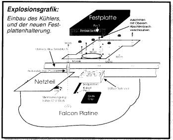Schließlich wird nur noch ein kleiner Schalter an der Außenseite des Gehäuses befestigt. Dieses dient der externen Halbierung des CPU- Taktes bei gleichbleibendem BUS-Takt. Eine - wir ich finde - sehr sinnvolle Funktion, da es durchaus einige Programme geben kann, die mit der höher getaktetet CPU nicht funktionieren, auf diesem Wege aber dennoch vom schnelleren Zugriff auf die Peripherie profitieren können. Zum Einbauen des Kühlelementes kommt endlich auch das mitgelieferte Blech zum Tragen. Es stellt eine Ersatz- Festplattenhalterung dar. Dieser Lüfter bzw. Kühler dient der Abkühlung des Grafikchips, da er bei langzeitigem Betrieb zu heiß werden könnte. Nach der leichten Montage des Lüfters und der Festplatte sollten Sie den Computer nun wieder zusammenschrauben und einen Testlauf wagen... Sofern Sie beim Anbau keine Fehler gemacht haben, sollte Ihre "Speed Resolution Card" nun funktionieren. Dennoch ist noch lange nicht alles überstanden, da es nun noch gilt, die Software korrekt zu konfigurieren.