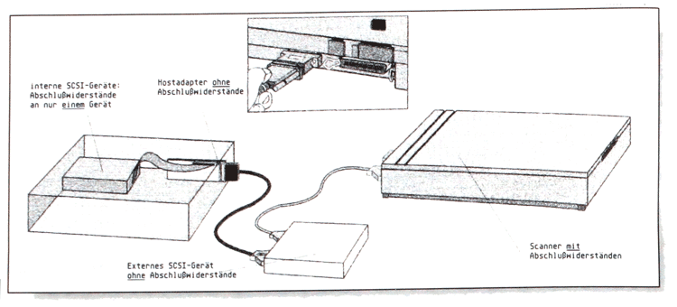 Hat man nun endlich beide, Scanner und Rechner, per SCSI glücklich vereint, am Scanner und in der Treibersoftware die SCSI-Gerätenummer korrekt eingestellt (defaultmäßig werden übrigens viele Scanner mit Target-Nummer 6 ausgeliefert), kann es trotzdem noch zu Überraschungen kommen. Es ist allgemein bekannt, dass der SCSI-Bus mit einer korrekten Terminierung steht und fällt. Wem dies bisher nicht so auffiel, weil er nur ein oder zwei interne SCSI-Geräte am Rechner hatte, der wird möglicherweise beim zusätzlichen Anschlug des Scanners eines besseren belehrt.