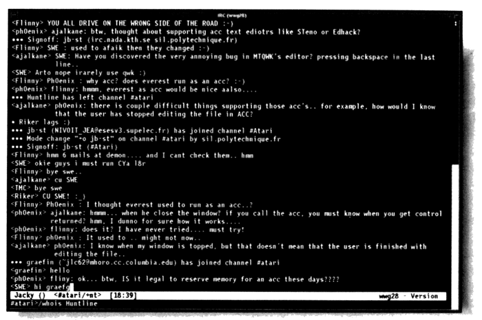 Es ist ein Mehrbenutzer-Chat-System, das dem Benutzer einen weltweiten Online-Chat mit anderen Usern bzw. Userinnen ermöglicht. Meist geschieht dies in sogenannten "Channels", also Kanälen, in denen man sich aufhält. Man kann hier nicht nur mit anderen Leuten über den üblichen Alltagstrott reden oder vielleicht mit etwas Glück die große Liebe finden (Hallo Babs!), sondern natürlich auch viele Leute aus der Atari-Szene treffen. Dies geschieht dann sinnigerweise auf dem Kanal #ATARI. Und gerade neuere Programme, wie z.B.