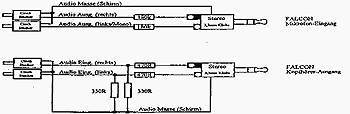 Außer beim C-Lab Falcon MkX, bei dem die Audioein- und Ausgänge aus zwei 6,3 mm Klinkenbuchsenpaaren bestehen, haben alle anderen Falconmodelle an dieser Stelle Stereokleinklinkenbuchsen. Hierfür braucht man also die passenden Adapter. Im Anhang der CAF-Anleitung ist die Beschreibung einer Hardwaremodifikation enthalten, die die Empfindlichkeit des Audioeingangs senkt, die Bassanhebung im Audioausgang entfernt und dessen Pegel verringert.
