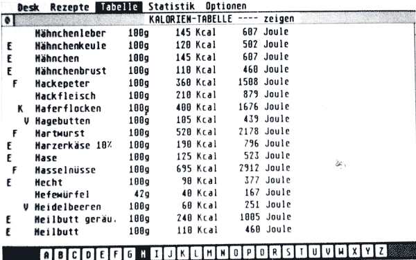 Nach dem Laden erscheint das Desktop-Bild auf dem Monitor. Dem Anwender stehen jetzt verschiedene Optionen zur VerfĂŒgung. Neben einigen Rezepten, die bereits auf der Diskette abgespeichert sind, kann man eigene eintragen, Ă€ndern, löschen, drucken und anschauen. Die einzelnen Rezepte werden alphabetisch geordnet angezeigt und bei Bedarf in Form einer Karteikarte grafisch dargestellt. Vermerkt sind dort alle Zutaten mit der entsprechenden Mengenangabe, die Kalorien- und Joule-Werte sowie die Zubereitungsanleitung. SĂ€mtliche Rezepte können auch ausgedruckt werden.