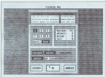 Die Größe läßt sich selbstverständlich frei wählen. Hierzu werden neben dem maximalen Speicherplatz auch die aktuelle Konfiguration und der bereits belegte Bereich angezeigt. Nur wenige RAM-Disk-Versionen beherrschen das Anpassen der Diskgröße zwischendurch, ohne daß der Inhalt verlorengeht! Die Disk läßt sich also jederzeit: problemlos verkleinern oder vergrößern! Der große Pluspunkt ist jedoch, daß die RAM-Disk automatisch mit den abgespeicherten Daten mitwächst! Auch ein 4-Mega-ST bringt "Flexdisk" nicht in Schwierigkeiten.
