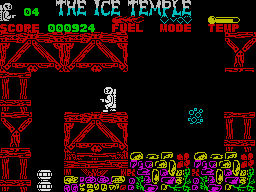 Die spärliche englische Anleitung zu "Ice Temple" von Bubble Bus sagt nichts über das Programm aus. Das spielt aber keine Rolle. Nach dem Laden sieht man sofort, woran man ist. Was die Programmierer von Ultimate schon vor Jahren unter dem Titel "Underwurlde" auf den Markt gebracht haben, kommt hier in neuem Gewand (und schlechterer Form) wieder.