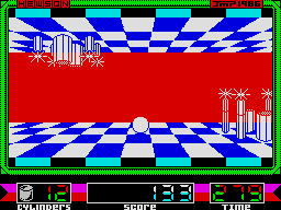 Jetzt aber zum Spiel. Das wichtigste Element ist tatsächlich ein weißer Ball, der über Tastatur oder Joystick vom Spieler gesteuert werden kann. Er bewegt sich hüpfend fort, wobei ein Druck auf die Feuertaste große Hüpfer bewirkt. Gespielt wird scheinbar in einer unterirdischen Halle, deren Boden und Decke mit einem