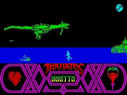 Durell schafft da Abhilfe. Im Programm "Thanatos" übernimmt der Spieler diese Rolle und rettet eine schöne Prinzessin. Der Drache kann fliegen, schwimmen, laufen und - natürlich - Feuer spucken. All diese Fähigkeiten braucht er für seine Aufgabe aber auch dringend, da überall Widersacher lauern. Mal sind es Ritter, die mit Pfeilen schießen, mal fallen Steine vom Himmel. Genug Action also, um auch routinierte Spieler bei Laune zu halten.