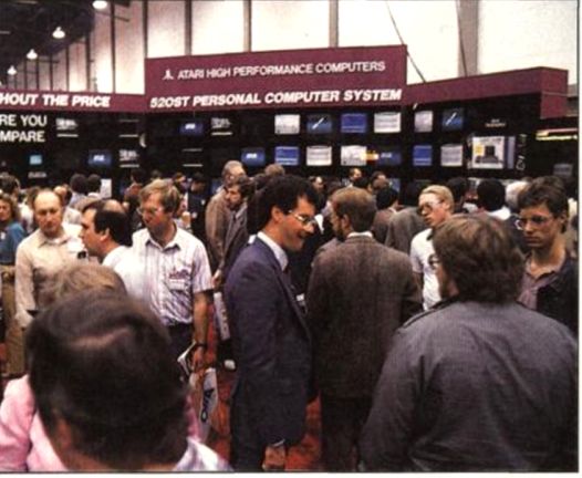 Bei den Computern kaum Neues. Lichtblick und Ärgernis gleichzeitig: Atari. Gedränge und etwas ratlose Gesichter am Stand. Ein neues Modell 1040 ST ist angekündigt, aber niemand findet es. Kein Wunder, denn der 1-MByte-Computer mit eingebauter Floppystation wird nur einigen Händlern und amerikanischen Journalisten in einer Suite des Hotelriesen »MGM« vorgestellt. 999,95 Dollar mit Schwarz-weiß-Monitor und 1199,95 Dollar mit Farbmonitor soll er kosten. Im Gegensatz zum 520 ST+ ist ein richtiger HF-Modulator für den Anschluß an ein Fernsehgerät eingebaut und in der rechten Geräteseite ein doppelseitiges, doppeldichtes 3,5-Zoll-Laufwerk integriert. An Software gehört ST Basic, 1st Word, Neochrome und ein VT52-Terminal-Emulator dazu. Das TOS wird als ROM geliefert. Wie zu erfahren war, soll der 1040 ST in Hannover auf der CeBIT auch in Deutschland gezeigt werden.