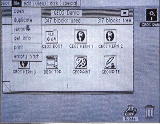 Das letzte große Anwendungsprodukt für den C 64 heißt »Geos« und ist ein komplett neues Betriebssystem. »Geos« ähnelt nicht nur vom Namen her dem vom Atari ST bekannten »GEM«. Bis auf einige Kleinigkeiten sind für den Benutzer »GEM« und »Geos« praktisch identisch. Zum System werden »Geo-Paint« und »GeoWrite« (ein Zeichen- und ein Textprogramm) mitgeliefert. Diese beiden erinnern wiederum sehr an »MacPaint« und »MacWrite« auf dem Macintosh. Der größte Unterschied besteht in der geringeren Ausführungsgeschwindigkeit, die aber zum normalen Arbeiten noch ausreicht. Der Joystick dient als Mausersatz. Außerdem wurde ein Floppy-Speeder integriert. Software-Entwickler, die Programme unter »Geos« entwickeln möchten, sollen sich an den Produzenten Berkeley Softworks wenden, um Unterlagen zu erhalten. Dort wird gerade an einer Dateiverwaltung und einer Tabellenkalkulation gearbeitet. Der Preis für »Geos« mit »GeoPaint« und »GeoWrite« soll nur knapp 60 Dollar betragen.