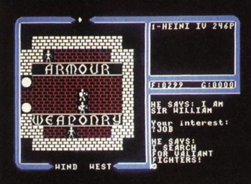 Anschließend geht es im Land Britannia richtig los. Die Grafik ist quasi mit der von »Ultima III« identisch und hat auch das geradezu schrecklich holprige Scrolling. aber bei diesem Spiel-Genre sind Grafik- und Sound Effekte ohnehin nur nebensächlich. Sie starten zwar allem auf Ihrer Mission, doch dieser einsame Zustand muß nicht von Dauer sein.