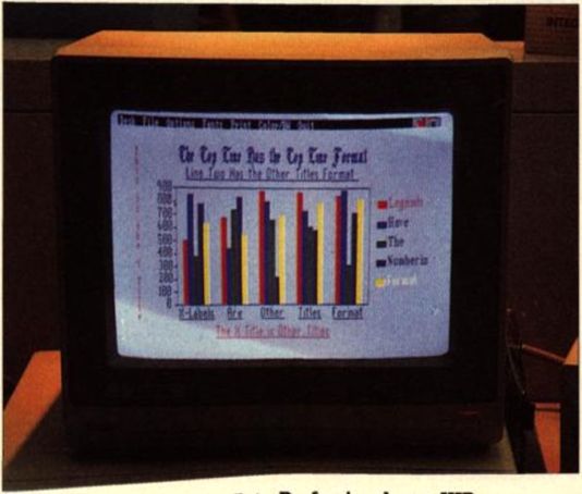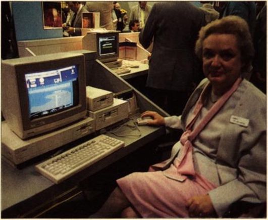 Besucher, die vom Atari-Stand zu Commodores Amiga-Stand wandern, finden viele der Softwarehäuser hier wieder. Aber bei Commodore ist Thema Nummer 1 nicht die Software, sondern der lang erwartete MS-DOS-Emulator. Entsprechend umlagert wird das Tischchen, auf dem er leibhaftig steht. In seinem Gehäuse sind eine 8083-CPU mit 4,77 MHz Taktfrequenz, ein 5,25-Zoll-Laufwerk mit 360 KByte, ein Netzteil und 256 KByte RAM untergebracht. Der Speicher kann auf 512 KByte RAM aufgerüstet werden. Der Einbau einer 20-MByte-Harddisk ist möglich. Im IBM-Modus laufen praktisch alle MS-DOS-Programme, mit und ohne Farbgrafik, allerdings genauso langsam wie beim Original-IBM-PC. Gaü Wellington, Commodores Software-Lady und -Entwicklungs-Managerin, führt uns den bekannten Flightsimulator vor. Gemäß ihrer Auskunft können bis zu drei Amiga-Programme im Multitasking-Betrieb zusammen mit einem MS-DOS-Programm ohne Geschwindigkeitseinbuße ablaufen. Der MS-DOS-Screen wird dabei wie ein Amiga-DOS-Window behandelt.