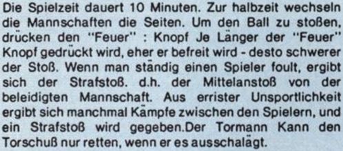 Um mal wieder für ein mitleidiges Lächeln zu sorgen, haben wir heute einen ähnlichen Fall entdeckt. Die Gebrauchsanleitung eines Fußballspiels für den C 16 wurde vom englischen Softwarehaus in ein weniger sattelfestes Deutsch übersetzt, (hl)