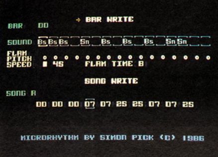 Um einen ganzen Song zu schreiben, gibt es den »Bar-Write«-Modus. Jedes Stück setzt sich aus einzelnen Sequenzen, sogenannten »Bars« zusammen. Die entsprechenden Eingabefelder befinden sich in der oberen Bildschirmhälfte. In jeder Bar haben bis zu 16 Informationen Platz, also Schläge oder Pausen. Sollte die Sequenz zu lang sein, läßt sie sich verkürzen, damit ein vernünftiges Stück dabei herauskommt. Man kann jede Sequenz in Ruhe eingeben, indem man mit dem Cursor durch die Liste fährt und eine Instrumententaste drückt. Pausen entstehen einfach durch freigelassene Felder. Für jede Eingabe läßt sich die Tonhöhe variieren, so daß noch mehr unterschiedliche Instrumente zur Verfügung stehen.