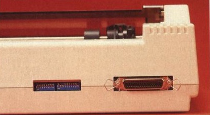 An der Gehäuserückseite führt der fest integrierte Netzstecker heraus. In der Mitte der Rückseite findet man guten Zugriff auf die zwei DIL-Schalterreihen, solange kein DIN-A3-Papier eingespannt ist. Dann werden die DIL-Schalter sozusagen »verbaut«. Ebenfalls auf der Rückseite befindet sich die Centronics-Schnittstelle. Die linke und vordere Gehäuseseite wurde völlig freigehalten.