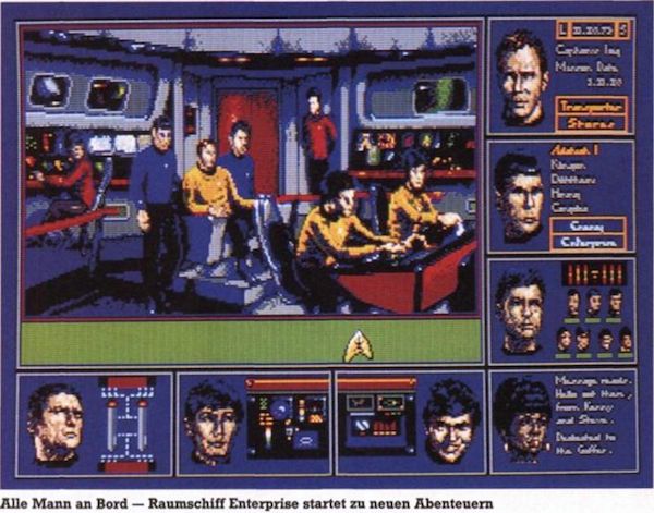 Alle sieben Hauptdarsteller der Serie kommen im Spiel vor und können von Ihnen kontrolliert werden: Captain Kirk. Mr. Spock (Wissenschafts-Offizier), Sulu (Navigation), Chekov (Waffensysteme). Uhura (Kommunikation). Scotty (Triebwerke) und »Pille« McCoy (Bordarzt). Obwohl jede dieser Personen verschiedene Funktionen durchführen kann, ist die Bedienung des Programms kinderleicht. Lediglich die Maus wird verwendet. die Tastatur dürfen Sie völlig vergessen.