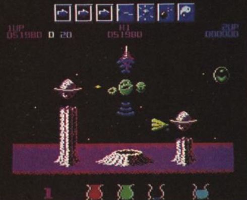 An die Farben heranzukommen, ist gar nicht einfach. Herumfliegende Farbkugeln müssen zuerst abgeschossen werden. bevor sie als Tropfen auf den Boden fallen. Nur Catelite kann Farbtropfen aufsammeln; Wizball hat diese Fähigkeit nicht. Dieses muntere Spielchen geht so lange, bis der Farbtopf ganz gefüllt ist. Dann folgt eine Bonusrunde, in der man viele Zusatzpunkte verdienen kann. Diese Runde dauert so lange, bis Wizball von einem Angreifer berührt wird. Er verliert dadurch aber nicht eines seiner Leben; die Bonusrunde wird lediglich abgebrochen. Durch pausenloses Ausweichen und Schießen sollte man gerade hier versuchen, sehr weit zu kommen. Nach einer ganzen Reihe von gegnerischen Formationen kommt nämlich ein Ebenbild von Wizball angeflogen. Gelingt es. diesen Doppelgänger abzuschießen. bekommt unser Held gar ein Extra-Leben spendiert. Extra-Leben kann man gar nicht genug sammeln, denn auf späteren Levels wird das Spiel ganz schön schwierig. Sogar die Farbtropfen fangen dann an, zurückzuschießen!