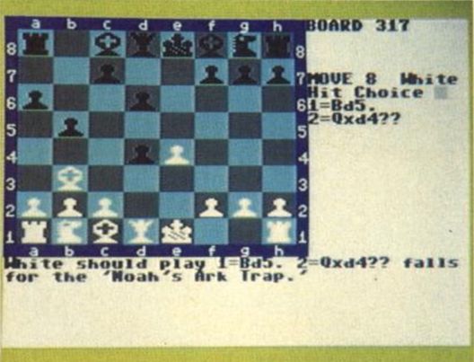 So beginnt die Arbeit stets mit der Frage, ob man das Tutorprogramm oder das Schachprogramm laden möchte. Entscheidet man sich für den Tutor, erscheint kurze Zeit später das Hauptmenü, das die sieben grundlegenden Lektionen enthält. Es beginnt mit den einfachsten Schachregeln, geht über die Eröffnung und das Mittelspiel und endet mit sehr weitreichenden Erklärungen über das Endspiel. Für Eröffnung und Endspiel gibt es sogar einen zweiten Teil mit weiterführenden Informationen. Man kann sich so gleich die Lektion heraussuchen, für die man sich interessiert. Wenn man noch me Schach gespielt hat. findet man in der ersten Lektion eine behutsame Einführung. Durch ein raffiniertes Menüsystem wird der Benutzer von Punkt zu Punkt geführt und erfährt alles Wichtige über das Schachbrett, die Figuren und die Schachregeln. Selbst die Rochade mit allen Ausnahmen und das En-passent-Schlagen der Bauern wird leicht verständlich erklärt. Das Programm benutzt für Vorgänge Beispiele auf dem Schachbrett, die Zug für Zug vorgespielt werden. Man kann nach eigenen Wünschen die Stellung durchspielen und jederzeit auch einige Züge zurückgehen. Durch die Demonstration auf dem Bildschirm sind Fehler beim Nachspielen ausgeschlossen.