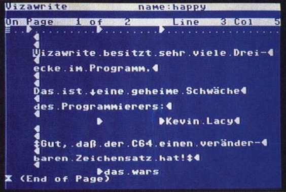 Anfang 1982 hörte er von einem neuen Commodore-Computer: dem C 64. In Europa gibt es zu dieser Zeit noch keine Geräte. Testberichte oder ähnliches, nur viele Gerüchte, über die fantastischen Fähigkeiten des C 64. Ein Punkt interessierte Kevin Lacy besonders: der veränderbare Zeichensatz. »Warum denn das«, will ich erstaunt wissen, »schließlich hat der C 64 doch eine englische Tastatur und Sonderzeichen.« »Das schon, aber keine Dreiecke«, erzählt er, entspannt zurückgelehnt, »ich mag einfach Dreiecke und der PET hatte keine in seinem Zeichensatz. Beim C 64 konnte ich endlich Dreiecke einbauen.« Und tatsächlich findet man jede Menge Dreiecke als Sonderzeichen in der C 64-Version von Vizawrite.