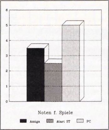 Die Spielewelle kommt jetzt beim ST ins Rollen, obwohl die meisten dieser Computer mit Monochrom-Monitor verkauft werden. Momentan sind viele Spiele, die den Farbmonitor voraussetzen, noch Umsetzungen von 8-Bit-Computern, aber es kommen auch hierfür verstärkt Spiele auf den Markt, die nur für den ST geschrieben wurden.