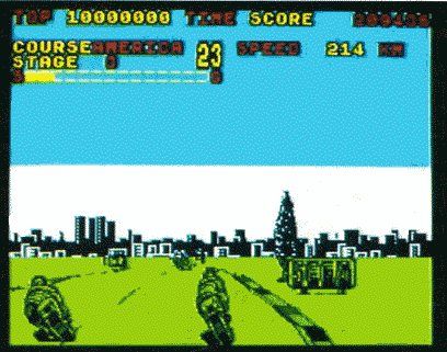 Und wieder dröhnen die Motoren: In »Super Hang-On« fÀhrt man ein Motorradrennen rund um die ganze Welt. Vor dem Start wÀhlt man einen von vier Kontinenten aus, auf dem das Rennen stattfinden soll. Jeder hat einen bestimmten Schwierigkeitsgrad. der von recht einfach bis zu fast unmöglich reicht. Ein Kontinent ist in verschiedene Strecken unterteilt. Wenn man nicht innerhalb einer vorgegebenen Zeit das Ziel erreicht, wird man aus dem Rennen genommen. Wenn man schneller ist. wird die verbliebene Zeit als Bonus gutgeschrieben.