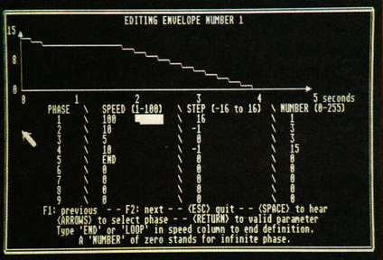 Zum guten Ton gehört es, Spiele, die durch ihre Grafik und schnelles Scrolling glänzen, mit dem passenden Sound auszustatten. Hierzu gehören sowohl die Hintergrundmusik als auch Spezialeffekte wie Explosionen und ähnliches. Hier bietet STOS eine Vielzahl einfacher Aufrufe, die dem Spieleprogrammierer das Leben erleichtern. So gibt es schon (est eingebaute Soundeffekte wie Explosionsgeräusche, Pistolenschüsse und Glocken Sollten diese Funktionen nicht ausreichen, können Sie dem Soundchip des Atari ST durch Verändern der Hüllkurve, Lautstärke und Geschwindigkeit praktisch alle Töne entlocken. Um die Entwicklung der Hintergrundmusik zu erleichtern, wird von STOS ein weiteres Zusatzprogramm zur Verfügung gestellt - der Musik-Editor. Hier kann man Musikstücke aus anderen STOS-Spielen verändern oder ganz eigene Kompositionen entstehen lassen. Für jede der drei Stimmen des Soundchips gibt es ein eigenes Überwachungsfenster, in dem man die Noten von Hand einträgt. Zusätzlich lassen sich die Noten in einem anderen Fenster grafisch darstellen und jederzeit auf einen Drucker ausgeben.