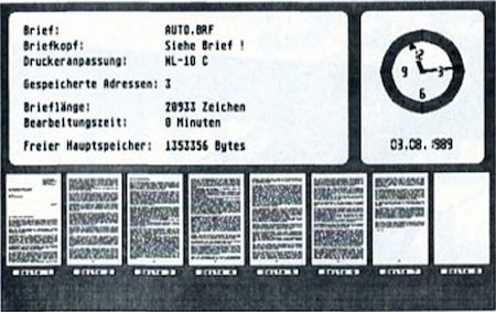 Eine sehr komfortable Funktion ist auch der Sammelausdruck. Sie schreiben einen Brief wie gewohnt und wählen dann unter dem Menü "Drucken" den Punkt "Brief. Erst fragt das Programm nach der Anzahl der Exemplare, dann können Sie wählen, ob der Brief sofort oder erst später gedruckt werden soll. Wenn Sie den Brief erst später drucken lassen wollen, müssen Sie ihn speichern; anschließend können Sie dann den nächsten Brief bearbeiten. Sind Sie mit allen Arbeiten fertig und wollen Ihre Briefe aus-drucken lassen, dann rufen Sie die Funktion "Sammel-Ausdruck" unter dem Menü "Drucken" auf. So kann man Briefe sehr schnell schreiben. ohne vom Drucker im Arbeitsfluß unterbrochen zu werden.