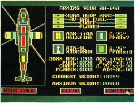 Nachdem Sie sich über die Mission im klaren sind, rüsten Sie Ihren Hubschrauber aus. Sie entscheiden, welche Waffensysteme Sie benötigen und wieviel Sprit Sie mitnehmen. Der Computer stellt Ihnen zwar eine optimale Ausrüstung für die Mission zusammen, Sie dürfen diese aber nach eigenem Bedarf verändern.