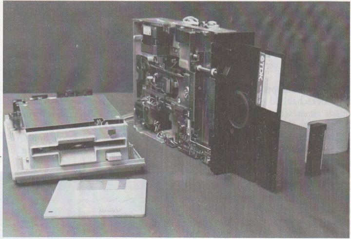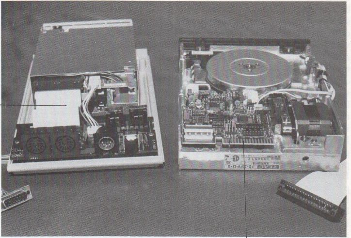 Bevor wir beschreiben, wie das 5 1/4-Zoll Laufwerk angeschlossen wird noch eine Warnung: Der Floppy-Anschluß sollte nicht von einem Laien, der sich noch nicht mit elektronischen Bastelarbeiten beschäftigt hat vorgenommen werden. Obwohl sich der eigentliche Anschluß nur auf ein 12-adriges Kabel bezieht, kann eine Fehlersuche oft langwierig und eventuell auch kostspielig sein. Da der 14-polige DIN-Stecker der Floppy, zur Zeit jedenfalls, noch nicht einzeln erhältlich ist, muß das vorhandene ATARI Laufwerk geöffnet werden und das neue Kabel von innen heraus geführt werden. Dabei kann man nach zwei verscheidenen Methoden Vorgehen. Die nun folgend beschriebene Methode haben wir bei unserem Testmuster angewandt.