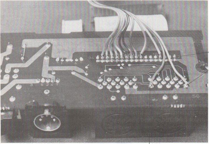 Bild 2: Anschlußplatine der ATARI-Floppy von unten gesehen. Unten: Pin 6 der DIN Eingangsbuchse (Drive Select 1), ganz oben: Anschlußstecker (J2), oben: Masse