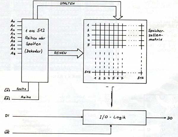 Mit neun Adreßleitungen kann man eine Reihe bzw. eine Spalte aus einer Matrix von 29 = 512 auswählen. Eine 512-Matrix kann also 512 x 512 = 262144 = 256 K Bit speichern (1K = 1024). Zum Auslesen bzw. Beschreiben eines Bits müssen die neun Adreßleitungen folglich zweimal hintereinander (sequentieller Zugriff) aktiviert werden, einmal in Verbindung mit einer Spalte der Matrix und noch einmal in Verbindung mit einer Matrix-Reihe. Erst jetzt ist ein Bit adressiert, nämlich am Knotenpunkt von Spalte und Reihe. Damit bei der Adressierung zwischen Spalte und Reihe unterschieden werden kann, verfügen die RAM-Bausteine über zwei Steuerleitungen. Diese heißen CAS (Column Address Strobe, Übernahme der Spalten-Adresse) und RAS (Row Address Strobe, Übernahme der Reihen-Adresse).
