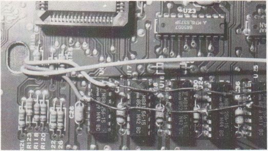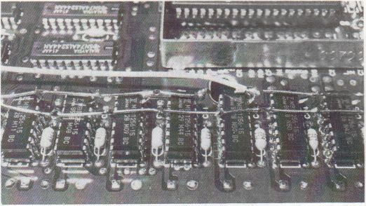 Kommen wir jetzt zum schwierigsten Teil der gesamten Umbau-Aktion. Die 16 zusätzlichen RAMs müssen mit den darunterliegenden verlötet werden. Natürlich bleiben die zwei nach oben abgebogenen Beinchen noch frei, sie werden danach separat verdrahtet. Bitte lassen sie sich für diese Arbeit Zeit und löten mit einer ruhigen Hand ein Pin nach dem anderen fest. Unsere Erfahrung zeigt, daß man oft aus übertriebener Vorsicht (Zerstörung durch Überhitzung) den Lötkolben eher zu kurz als zu lang an eine Lötstelle hält. Schlechte und kalte Lötverbindungen sind die Folge. Schon eine schlechte Verbindung genügt, und der Rechner erkennt die zusätzliche RAM-Bank nicht an.