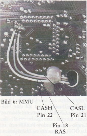 Der Pin 15 der linken acht RAMs wird nun über eine isolierte Leitung zur MMU Pin 21 (CAS 1 L) geführt, und der gleiche Pin der rechten acht RAMs zum Pin 22 (CAS 1 H) der MMU. Der Pin 18 (RAS 1) der MMU wird über eine Leitung mit Pin vier aller RAMs verlötet. Die drei isolierten Zuleitungen werden von der MMLJ an der Unterseite der Platine nach oben auf die RAMs geführt, und zwar am Besten durch das Loch, das sich zwischen der MMU und dem GLUE-Chip befindet. Dies sind die beiden quadratischen Chips auf der Platine (siehe Foto).