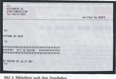 Die Sende- Empfangsumschaltung erfolgt durch Drücken der Taste Danach schaltet der Rechner mittels der PTT-Leitung den Sender ein und wartet auf eine Eingabe der Tastatur. Ein ’TX:’ kennzeichnet den Sende-Modus. Gut gelöst wurde das Aussenden von Standardtexten, wie z. B. CQ-Rufe, Stationsbeschreibung, etc.. Gab es bisher nur die Möglichkeit, solche vorbereiteten Texte fest im Programm und somit nur schwer änderbar unterzubringen oder aber im RAM, wo sie nach jedem Ausschalten des Rechners gelöscht werden, so werden Ihre Texte hier als ASCII-File auf Diskette geschrieben. Damit sind diese Texte jederzeit leicht änderbar und trotzdem dauerhaft auf der Systemdiskette gespeichert. Außerdem sind sie in ihrer Länge nur durch die Diskettenkapazität beschränkt, was wohl in jedem Fall ausreichen dürfte. Diese Texte (ASCII-Files) können mit jedem Editor bzw. Textverarbeitungsprogramm erstellt werden. Mitgeliefert wird der Editor ST-WRITER. Den Texten kann man einen beliebigen Namen geben, der allerdings auf ’.F < n > ’ enden muß. Dabei steht < n > nur als Platzhalter für eine Zahl zwischen 1 und 10, welche später der Funktionstaste entspricht, mit der der Text im Sende-Modus aufgerufen wird. So wird z. B. ein Text-File mit dem Namen CQCQCQ.F1 mit der Funktionstaste Fl aufgerufen und automatisch gesendet. Das Programm sendet keinen automatischen Zeilenvorschub / Wagenrücklauf, erinnert jedoch nach 54 Zeichen durch eine Glocke daran.Nach 64 Zeichen ertönt die Glocke dann nach jedem Tastendruck. Durch Drücken der 'Return’- bzw. 'Enter’-Taste wird ein Wagenrücklauf und Zeilenvorschub gesendet. Betätigt man nochmals die Taste wird der Sende-Modus verlassen und auf Empfang umgeschaltet. War der gesendete Text jedoch länger als 30 Zeichen, wird automatisch noch das eigene Rufzeichen und die Uhrzeit mit ausgesendet (siehe Bild 2). Diese Tatsache soll den lizensierten Funkamateur vor Störern bzw. Raubkopierern schützen. Da das eigene Rufzeichen fest ins Programm eingebaut ist, muß es bei Bestellung mit angegeben werden.