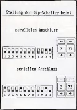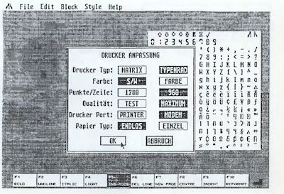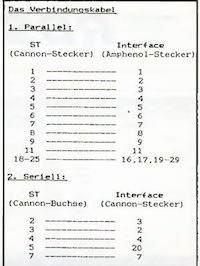 An der Rückseite der Interface-Box befinden sich zwei Standard-Buchsen für die Verbindung zum Rechner. Für die parallele Schnittstelle wird ein 36-poliger Amphenol-Centronics-Stecker benötigt, wie er auch zum Anschluß gebräuchlicher Matrix-Drucker verwendet wird. Für die Verbindung mittels der seriellen RS 232 Schnittstelle wird am Interface ein 25-poliger Cannon-Stecker benötigt. Da die Interface-Box über einen eigenen Mikroprozessor verfügt, gibt es an der rechten Seite einige Schalter, mit denen sich alle nur denkbaren Funktionen, Zeichensätze, etc. einstellen lassen. Wir wollen hier nur auf die Einstellung der Dip-Schalter eingehen, damit eine einwandfreie Datenübermittlung mit dem ST gewährleistet ist. Die weiteren vielfältigen Möglichkeiten der Interface-Box entnehmen Sie bitte dem Handbuch. In den beiden Skizzen ist die Einstellung der Dip-Schalter für „parallelen“- sowie „seriellen“ Betrieb dargestellt. Die Schalter sind auf die maximale Übertragungsgeschwindigkeit von 9 600 Baud eingestellt. Es sei noch erwähnt, daß wir mit dem Textverarbeitungsprogramm Ist Word (1.04) arbeiten und auf der Programmdiskette zwei Druckeranpassungen initialisiert haben. Dadurch ist es möglich, sozusagen „gleichzeitig“ einen Matrix-Drucker (parallel) und die Schreibmaschine als Schönschreibdrucker (seriell) anzuschließen und zu benutzen. Die Auswahl, über welchen Port nun ein Textfile ausgedruckt wird (parallel oder seriell), erfolgt vom Desktop mittels der „Drucker-Anpassung“ (siehe Hardcopy). Wird darin der Druckertyp „Matrix“ und als Drucker-Port „Printer“ angeklickt, so erfolgt die Ausgabe des Textes über die parallele Schnittstelle mit dem Druckeranpassungs-File „IST PRNT.DOT“. Wird hingegen als Druckertyp „Typenrad“ und als Druckerport „Modem“ angeklickt, so wird Ihr Text mittels der Druckeranpassung für die Schreibmaschine „IST PRNT. DSY“ über die serielle Schnittstelle ausgegeben. Zum Schluß noch die empfohlenen Verkaufspreise incl. MwSt.: Gabriele 9009 DM 1098,- und Interface-Box IFD 1 DM 377, - .
