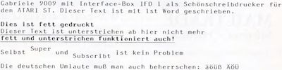 In diesem Bericht wollten wir Ihnen die Hardware-Voraussetzungen für einen wirklich problemlosen Betrieb der Schreibmaschine zeigen. Die Software, also eine Druckeranpassung, wird dann im nächsten Heft folgen. Als Kostprobe drucken wir hier ein Textbeispiel ab, das mit der Gabi 9009 mit Typenrad „Shadow 10/12“ geschrieben wurde. (UB)