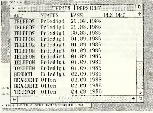 Ende August konnte man dann endlich diese gehobene Adressverwaltung mit integriertem Terminplaner bewundern. Zuerst wollte man, so die beiden Entwickler, wie bei den Produkten BS-LAGER und BS-FAKT den Programmteil Adressverwaltung von BS-HANDEL einzeln anbieten. Doch da der Softwaremarkt mit gewöhnlichen Adressverwaltungen geradezu überhäuft ist, wurde eine mit der Adressverwaltung zusammenarbeitende Terminverwaltung hinzugenommen. So tun sich dem Anwender ganz neue Möglichkeiten auf. Gespeicherte Adressen lassen sich mit BS-TIMEADRESS nicht nur für Serienbriefe oder für Telefonlisten weiterverarbeiten, sondern auch mit Terminen, Treffen, Anrufen oder Besuchen verknüpfen. Dank der hohen Flexibilität beider Programmteile, auf die ich später noch eingehen werde, ist BS-TIME-ADRESS in fast jedem Anwendungsgebiet einzusetzen.