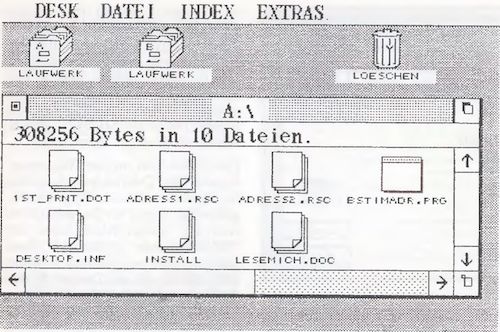 Nun hat man einen „Schreibtisch“ auf dem Bildschirm, der mit lauter Pikto-grammen oder sogenannten „Icons“ belegt ist, mit denen alle Funktionen entweder durch Überlagerung oder durch Anklicken angesprochen werden. Die Programmierer bedienen sich bei dieser Anwendung der Benutzeroberfläche GEM, wie es kein anderes Programm auf dem ATARI ST (bis vielleicht auf KUMA SPREAD und GRAPH) vorher tat. Das einzige Pull-Down Menü, das man hier vorfindet, ist nur für das DESK-INFO und die Accessories gedacht. Das größte Icon ist nicht anklickbar, sondern dient dem Benutzer nur als Information, wieviele Adressen und Termine verwaltet werden. Doch was bedeuten jetzt die verschiedenen Bilder, die eher an ein Grafikprogramm erinnern?