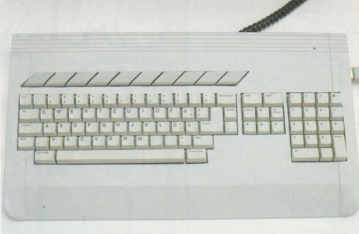Die Tastatur wird dabei in ein separates, ergonomisches Gehäuse integriert, welches über ein Spiralkabel mit dem PC-Gehäuse steckbar verbünden ist. Dieses Standard-Modell kostet komplett - eingebaut und umgerüstet - mit Monitor und Maus sowie den ROMs DM 3990, -. Bemerkenswert ist, daß die zum Teil sehr wackligen DIN-Stecker am ATARI ST durch verschraubbare Cannon-Stecker bzw. Buchsen ersetzt werden. Außerdem befindet sich auf der Rückseite zusätzlich eine SCART-Buchse, eine MIDI-Through-Buchse, sowie zwei Steckdosen zum Anschluß eines Druckers und Monitors. Möchte man einen größeren Massenspeicher in seinem System integriert haben, kann auch noch eine Festplatte mit verschiedenen Speicherkapazitäten eingebaut werden.