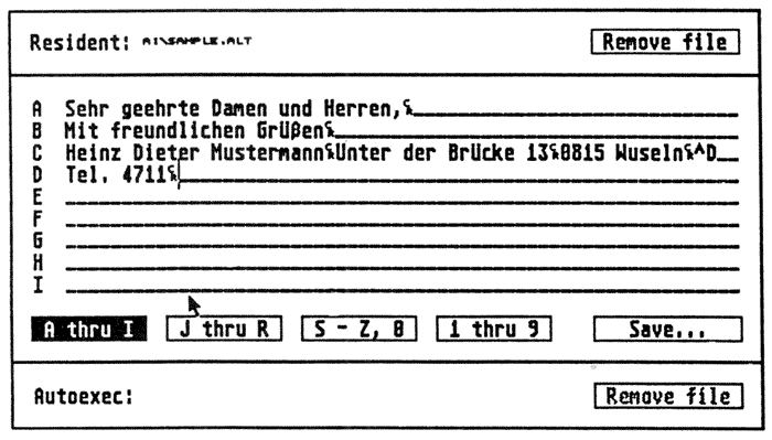 Es gibt zwei Wege ein Tastaturbelegung zu laden: Automatisch beim Booten oder manuell. Um „ALT“ mitzuteilen, welche Datei automatisch eingeladen werden soll, klickt man auf ’Autoexec’ (siehe Bild 1 links unten) und kann aus dem Fileselector eine Datei auswählen, die beim nächsten Bootvorgang geladen wird. Analog dazu funktioniert auch das Laden einer Datei während der Arbeit. In diesem Fall wird 'Resident’ (siehe Bild 1 links oben) angeklickt. Auch dann erscheint der Fileselector und die gewünschte Datei wird sofort geladen.