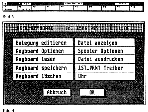 Alle Produkte sind Desk-Accessories. Sie stehen somit in jeder GEM-Anwendung ständig zur Verfügung. Nach dem Booten wird eine Tastaturbelegung geladen und kann sofort benutzt werden. Wenn eine Taste oder Tastenkombination gedrückt wird, die mit einem String belegt ist, dann wird dieser String an das laufende Programm übergeben, als wären alle Zeichen von Hand eingetippt worden. Man kann z. B. den Standardtext „Mit freundlichen Grüßen“ auf die Tastenkombination Shift + Fl legen und durch Betätigen beider Tasten in der Textverarbeitung abrufen. Dieses Verfahren funktioniert bei Ist Word Plus hervorragend und dürfte auch bei anderen Textverarbeitungen keine Probleme bereiten. Leider arbeitet keines der drei programme mit der neuen Textverarbeitung SIGNUM zusammen. Soviel zu den Gemeinsamkeiten der Programme.