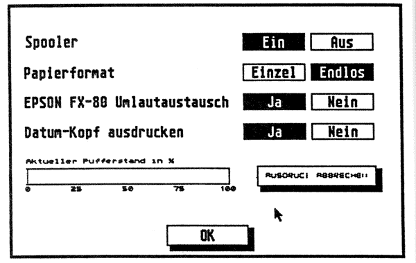 Mit „Spooler Optionen“ kann der eingebaute Druckerspooler konfiguriert werden. Bild 5 zeigt die dazugehörige Dialogbox. Der Spooler ist für alle Druckausgaben außer Hardcopies aktiv. Er hat eine Größe von 20 KByte und ist abschaltbar. Besitzer eines EPSON FX-80 können Dateien, die deutsche Umlaute enthalten, bei eingeschalteter Option „Umlautaustausch“ richtig ausdrucken. Dies funktioniert jedoch nur mit der eingebauten Funktion „Datei ausdrucken“, die auch wahlweise auf jede Seite eine Kopfzeile mit Dateiname, Datum und Seitennummer druckt.