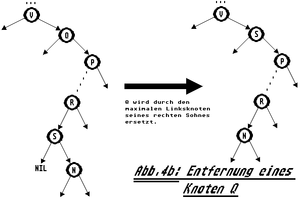 Es wird mit einem rekursiven Aufruf von remove mit seinem Rechts bzw. Linksnachfolger die Stelle gesucht, an der Elemente ausgefügt werden sollen. Gerät man dabei an einen nil-Zeiger, so ist die Suche beendet und das Element ist nicht gefunden worden.