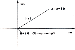 Neben der waagerechten Komponente, dem Realteil, hat eine komplexe Zahl noch eine senkrechte Komponente, den Imaginärteil. Um die Zahl leichter darstellen zu können, teilt man sie in die beiden Komponenten auf: z = (a,b). Die komplexe Zahl z hat den Realteil a und den Imaginärteil b. Diese Darstellung ist ähnlich einer gewöhnlichen Ebenendarstellung. Es gibt aber noch eine zweite Schreibweise: z = a+ib. Die Zahl i hat die ganz besondere Eigenschaft i2 = -1, sie ist also die Quadratwurzel aus -1! Im Bild 1 ist eine graphische Darstellung der komplexen Zahlen zu sehen.